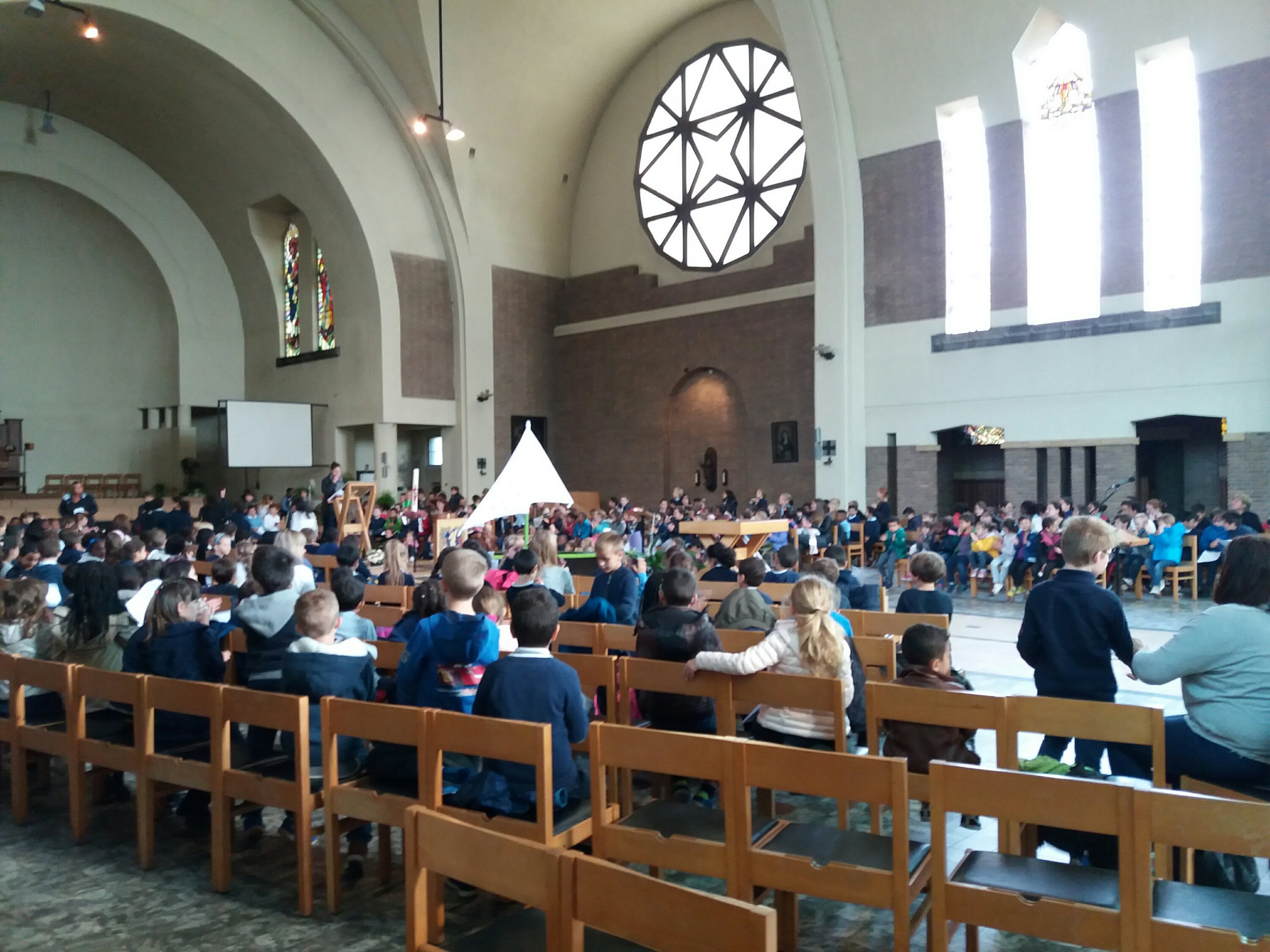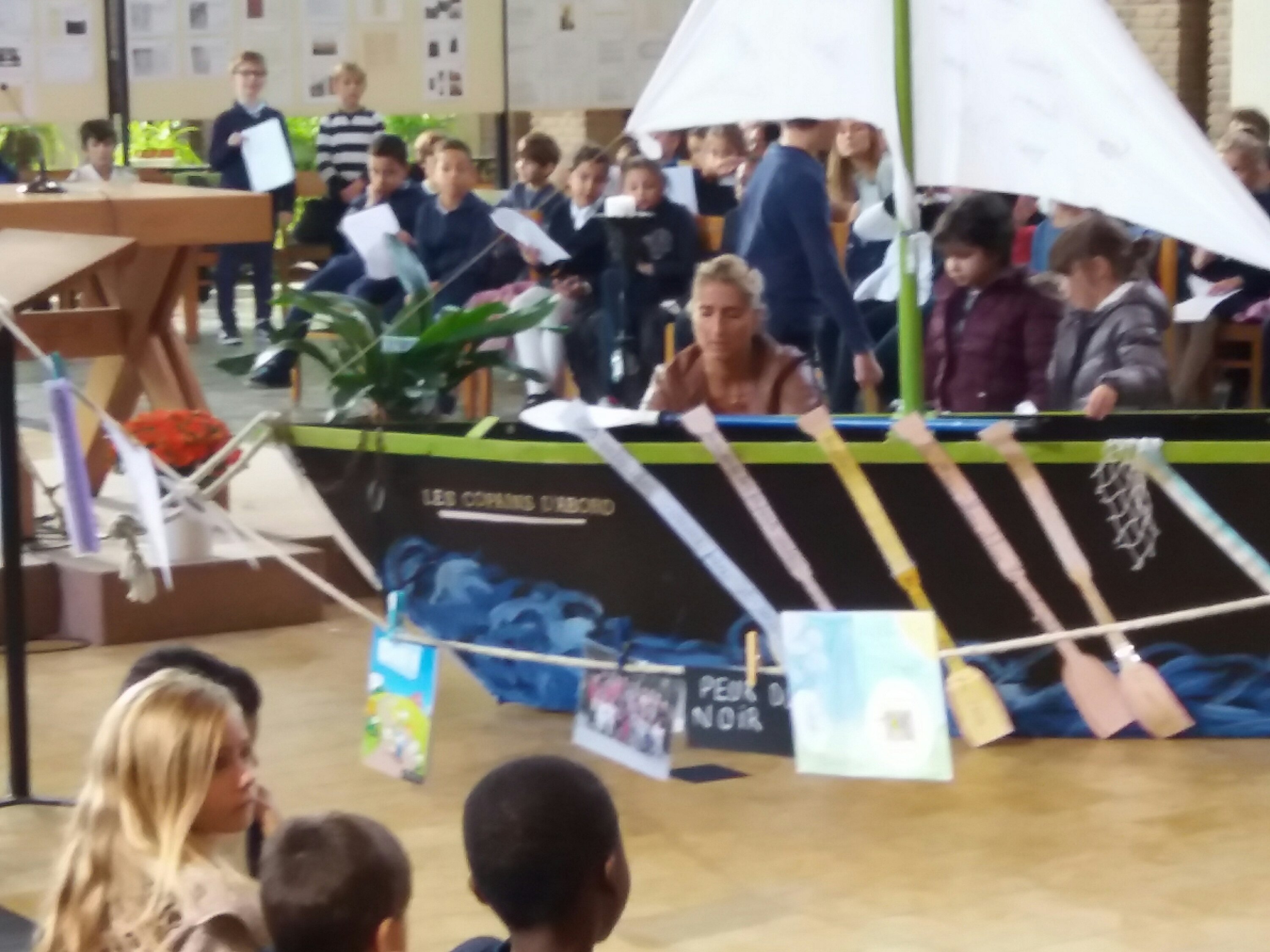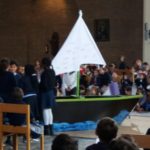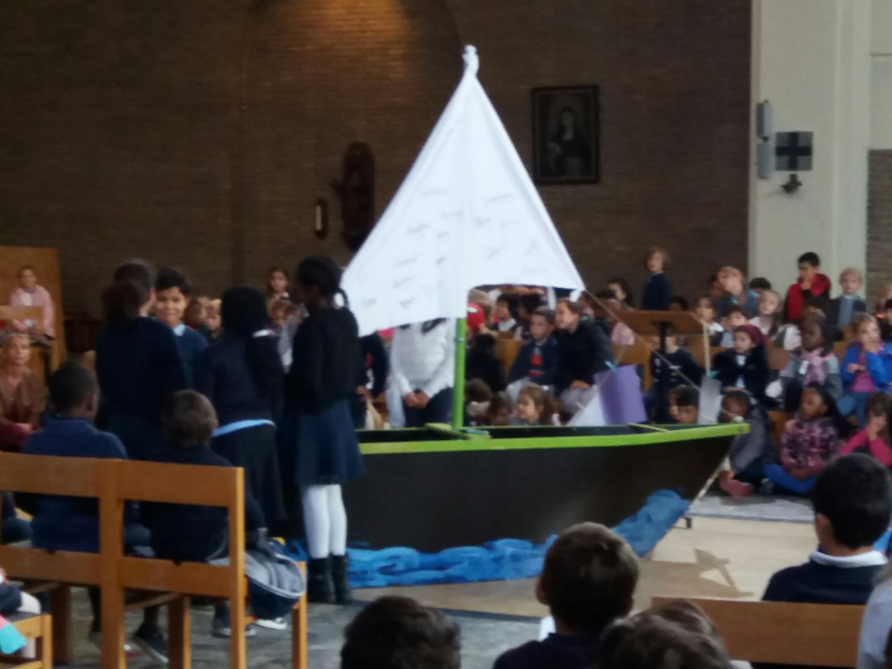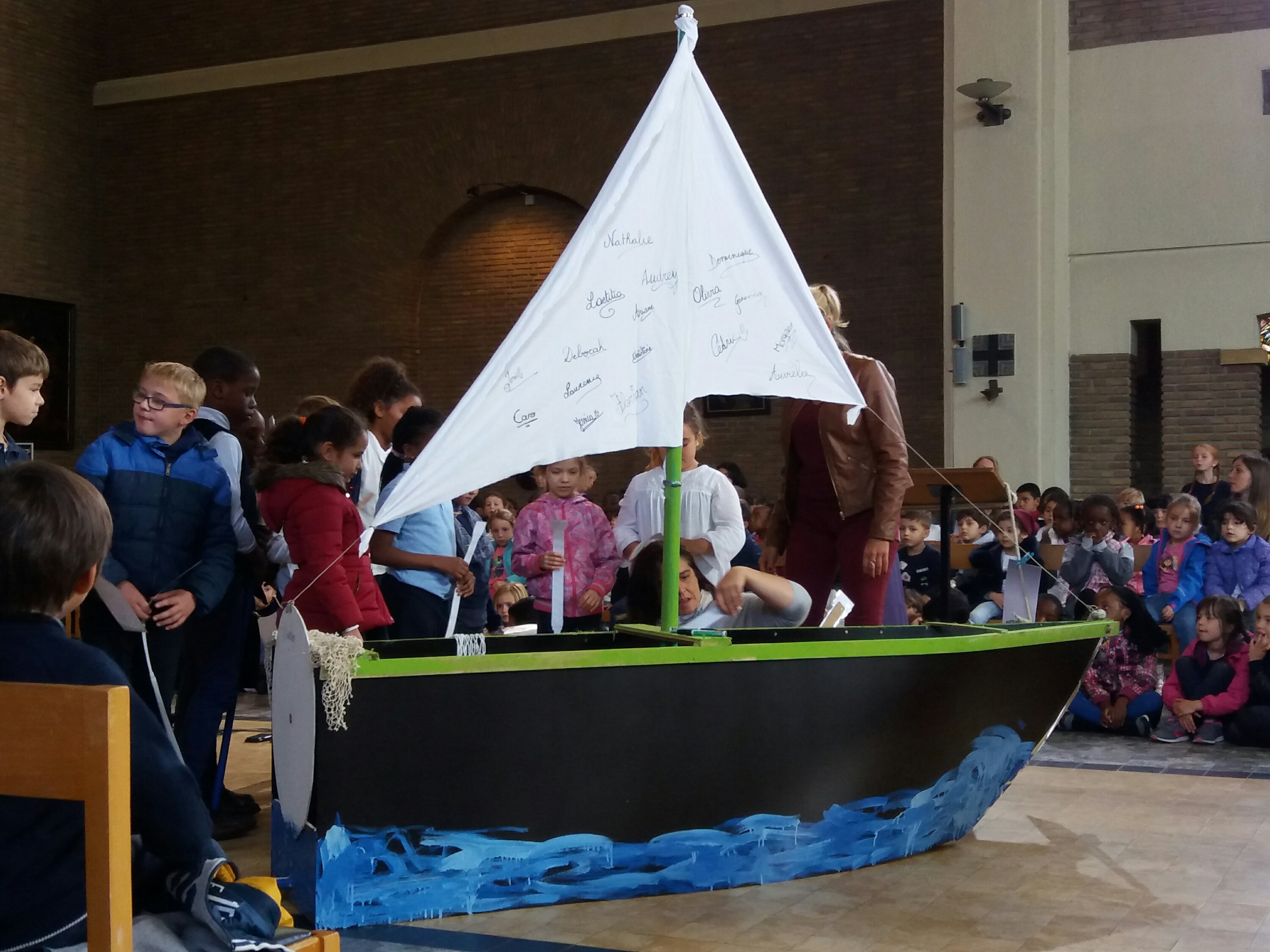 Aujourd’hui, 21 septembre, nous sommes allés à l’église pour notre célébration de la rentrée. Notre bateau se nomme « Les copains d’abord”, car l’amitié fait aussi partie de la réussite scolaire ! Nous avons chanté, présenté un acrostiche expliquant le nom de notre embarcation, mimé le texte de la Bible. Nous avons aussi accroché des objets représentant nos peurs sur l’amarre que nous avons ensuite coupée, car nous devons nous libérer de nos craintes pour avancer… tous ensemble.